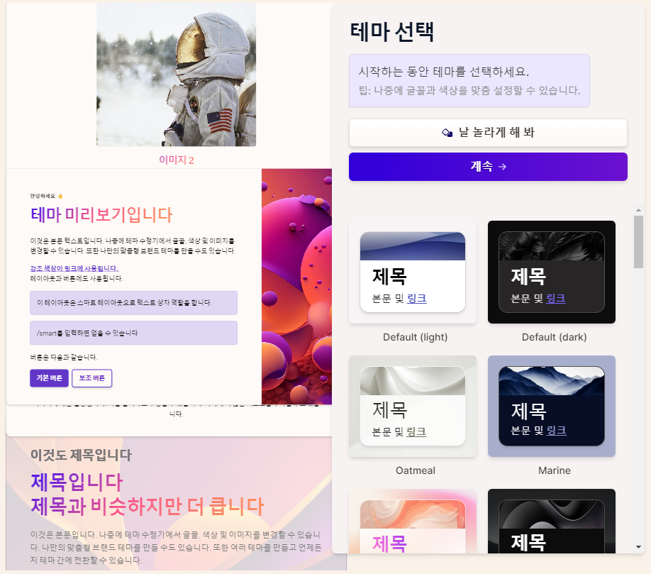 (4) 마지막으로 테마 선택 화면으로 나옵니다. 오른쪽의 다양한 테마 중에서 마음에 드는 테마를 선택(결정) 합니다.