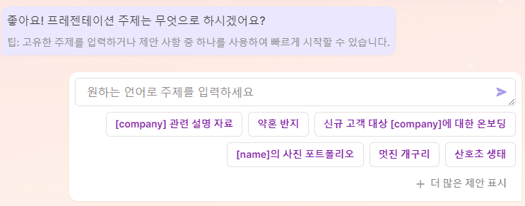 또는 '텍스트에 붙여 넣기'의 경우 기존 작성한 내용을 붙여 넣고 PPt를 만들기를 요청할 수 있습니다.